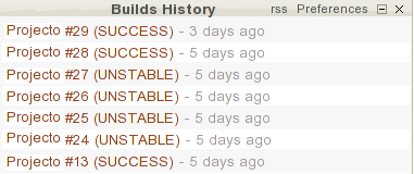 - Build History: this widget is available for both personal and project dashboard. It is linked to only one job, and show the build history, under the form of RSS feed. For each build of the list, you can see the build number, the status and the date the build has been scheduled.