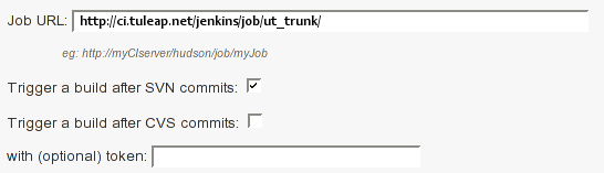 You may also want to enable the auto trigger of the build for this job after each commit in your project repository (CVS or Subversion). If you have protected your build with a token, you can specify this token (see Builds Schedule for more information). By checking this option, each commit will trigger a build of the associated job, using the pre-commit hook (you don’t have anything more to do).