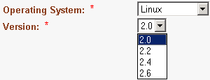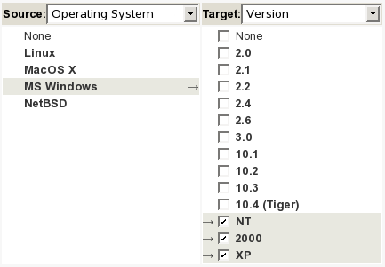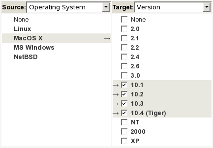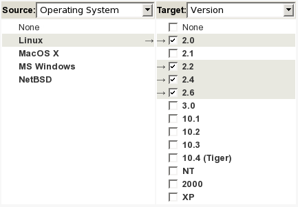 As an example, if you define a field Operating System(Linux, MacOS X, MS Windows, NetBSD) and a field Version(2.0, 2.1, 2.2, 2.4, 2.6, 3.0, 10.1, 10.2, 10.3, 10.4 (Tiger), NT, 2000, XP), you can define dependencies in the tracker administration interface:
